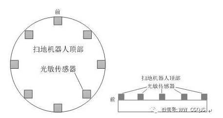 床底、沙發(fā)底、柜子底等地方相對(duì)較臟,因此這些地方需要重點(diǎn)清掃,以保證清潔度。為實(shí)現(xiàn)此功能,在掃地機(jī)器人正面安裝8個(gè)光敏傳感器。
