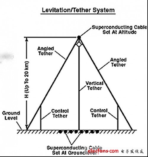1609公里長(zhǎng)的發(fā)射軌道處在真空管中,使太空列車加速5分鐘,達(dá)到每秒9公里的速度,進(jìn)入近地軌道。地面上的超導(dǎo)電纜承載2億安培,發(fā)射管中的超導(dǎo)電纜也有2億安培,那么,在20公里的高空,懸浮力大約會(huì)是每米電纜長(zhǎng)度4噸,這就足可以懸浮起發(fā)射管。