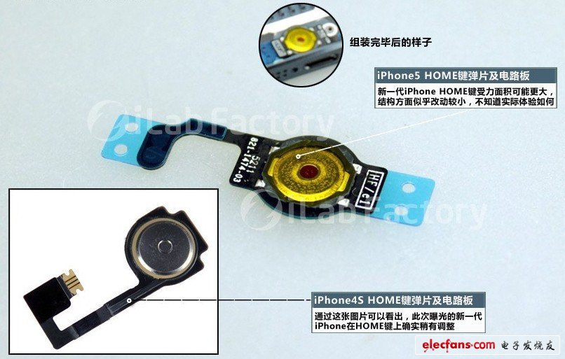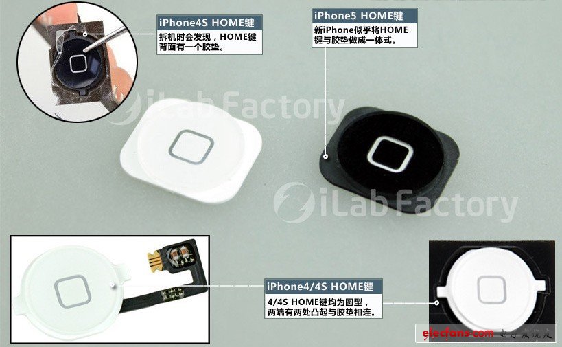 看完設計圖,再來欣賞iPhone5拆解首曝光!對比4S解析其新改進:新一代iPhone HOME鍵受力面積可能更大,結構方面似乎改動較小,不知道實際體驗如何。