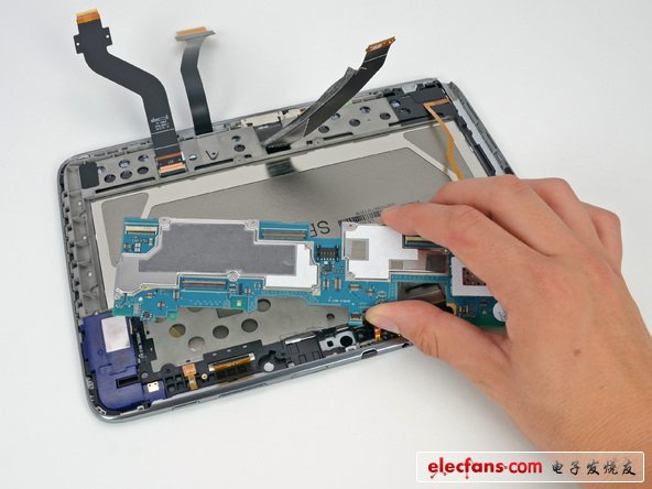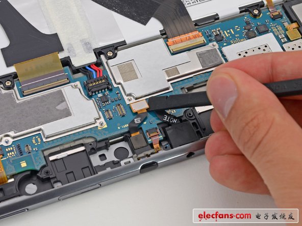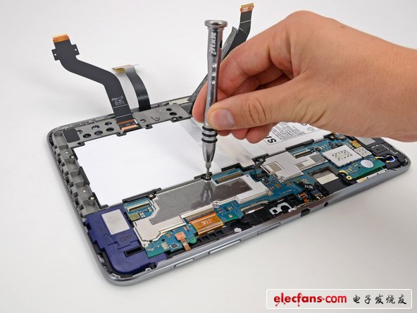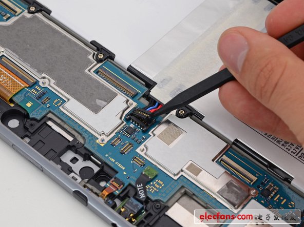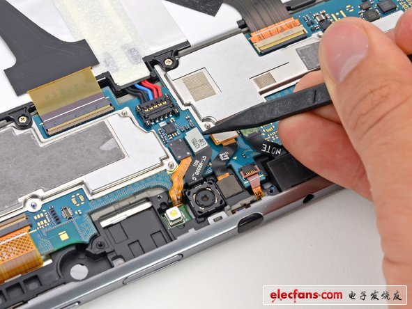除非EMI保護(hù)罩恰好是靠螺絲固定的,就好像這個(gè)平板上面一樣。我們喜歡螺絲,尤其在那些通常情況下需要拆焊的元器件上面。這是我們看到第一個(gè)用螺絲固定EMI保護(hù)罩的設(shè)備,支持你,三星。