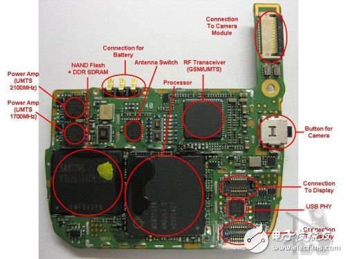 有兩個主電路板容納了大部分元件。主電路板在左邊被標(biāo)出,“Chin”電路板在第8步給出。NAND閃存+DDR內(nèi)存則采用了三星的MCP。SMSC提供了USB PHY用來處理PC和處理器的連接。
