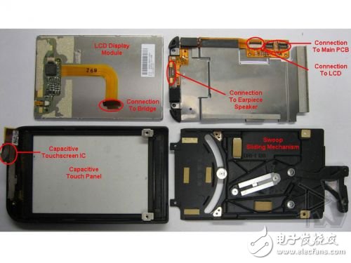 這部分是很酷的,因?yàn)樵谄聊坏膬?nèi)部有四大部分。實(shí)際的外套前面是電容式觸摸面板,采用新思科技的觸摸控制器以及一切和觸摸屏有關(guān)的東西。這款手機(jī)的一個有趣特點(diǎn)是采用了雙振動電機(jī)。一個電機(jī)安裝在顯示模塊中,另一個在主電路板上。