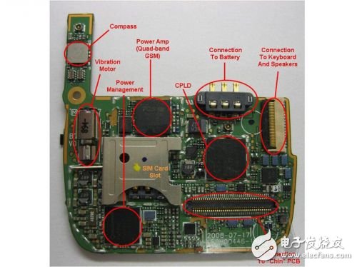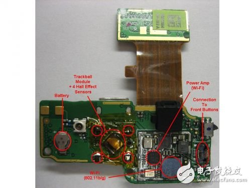 最后,我們將視線移到“Chin”電路板上。德州儀器提供了藍(lán)牙和Wi-Fi芯片,都出現(xiàn)在這塊電路板上了。軌跡球模塊和幾乎用在每款黑莓手機(jī)上的一樣。