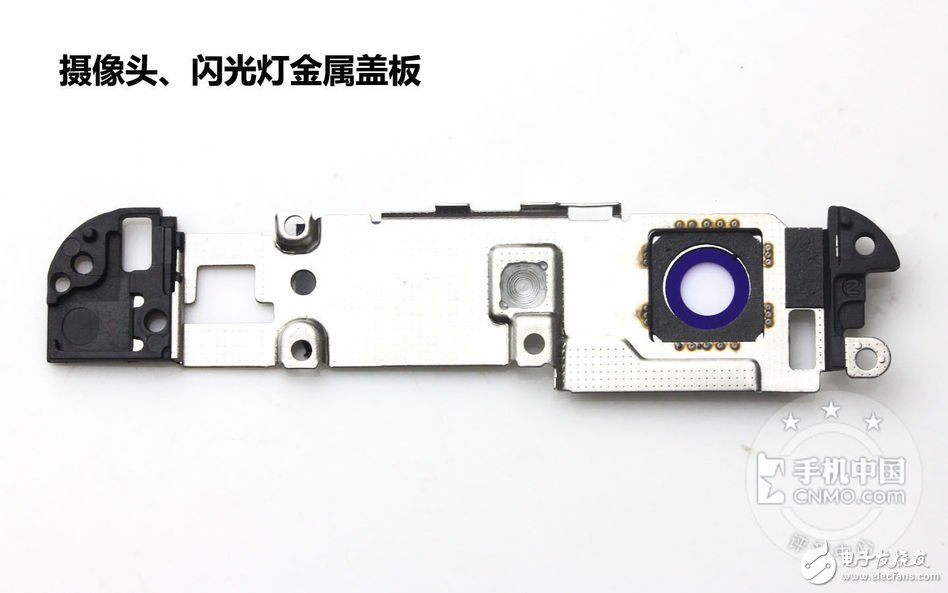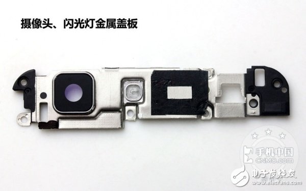 再來(lái)看攝像頭部分的蓋板,它大體部分采用了金屬材質(zhì),兩側(cè)為塑料。該部分集成著攝像頭鏡頭罩和閃光燈罩。