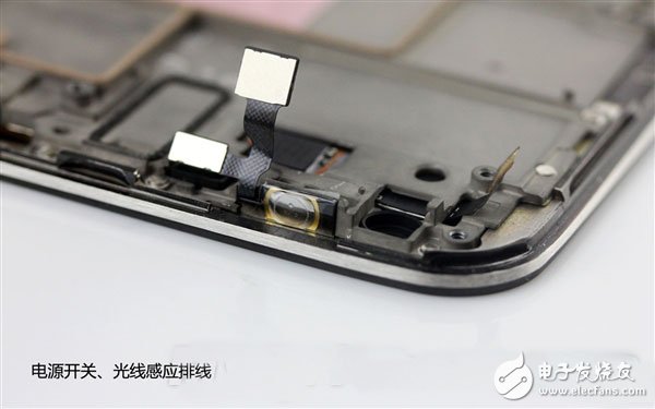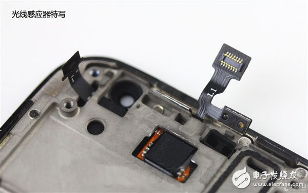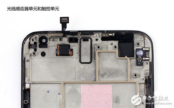 光線感應器和前置攝像頭用卡扣固定在前面板上,并沒有設計在主板上,此部分還可拆除聽筒、振動單元。電池部分依舊是很頭疼,真是強力膠啊,在撬的時候需要注意電池下方的主板連接排線。