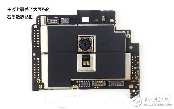下面進入主板部分,主板正面覆蓋了大面積的石墨散熱貼紙,該部分還集成了主攝像頭,可拆卸。不過貼紙下方的屏蔽罩焊死在了主板上,無法正常拆除。