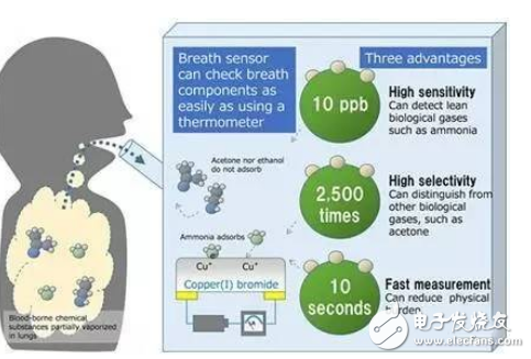 鑒于人類呼吸排出的氨氣與肝臟代謝、幽門螺旋桿菌感染(胃癌風(fēng)險因素)存在關(guān)聯(lián),F(xiàn)ujitsu Laboratories應(yīng)用溴化亞銅的氨氣吸附特性開發(fā)了一款能夠檢測微量氨氣的傳感器,用于檢測人類呼出氣體中氨氣的含量,這款傳感器對氨氣的靈敏度高于其它氣體約2500倍。