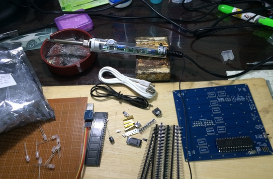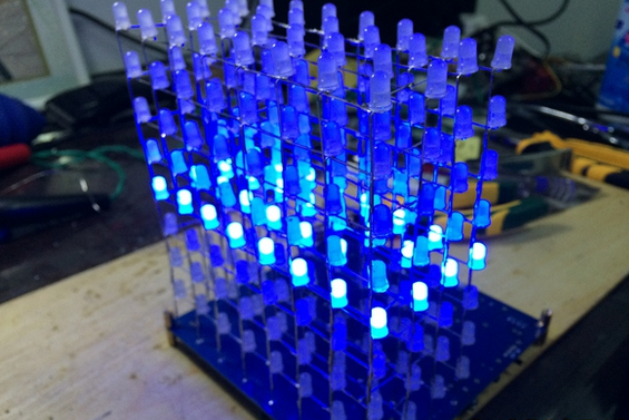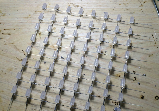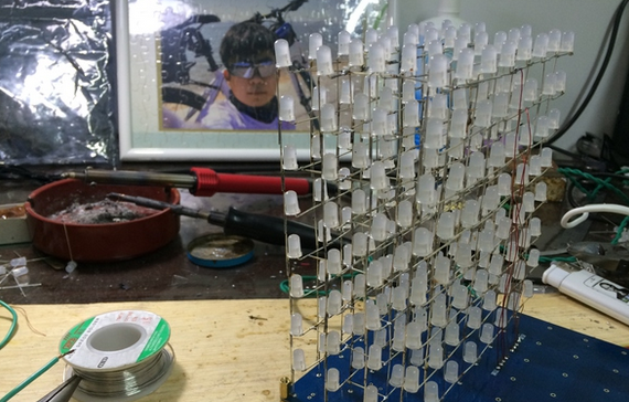 因?yàn)槭橇⒎襟w8x8為立方體中的一個(gè)切片,8哥切面就能做成一個(gè)立方體。每個(gè)64個(gè)LED折好之后,用電烙鐵焊成其中一片。