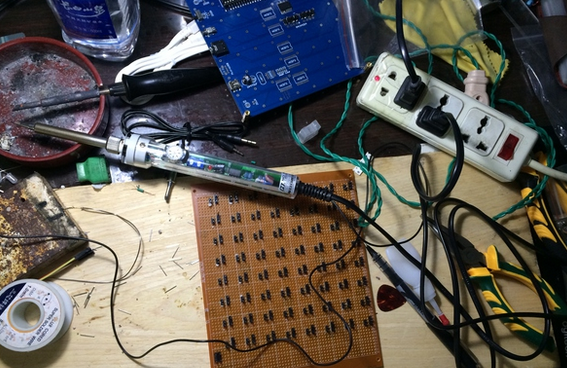 同步進(jìn)行制作的還有電路板部分,零件都很小,要用鑷子才能夾住焊接。焊完這幾個(gè)集成塊和貼片電阻,感覺(jué)自己的電烙鐵水平明顯上升一個(gè)檔次