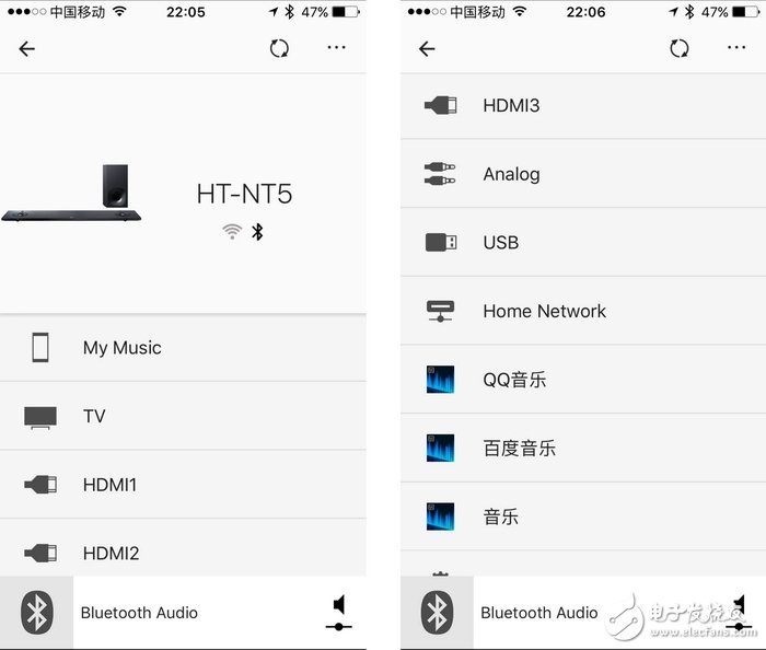 SongPal與HT-NT5之間的連接除了經(jīng)過(guò)網(wǎng)絡(luò)之外,也可以通過(guò)藍(lán)牙,總之都是無(wú)線的,一次連接一勞永逸。在SongPal里,HT-NT5幾乎所有的功能在這里都可以設(shè)置,與遙控器相比,這里看上去更直觀簡(jiǎn)單一些。手機(jī)APP操作設(shè)備已經(jīng)是一種趨勢(shì)了,也也是一個(gè)廠商實(shí)力的體現(xiàn)。