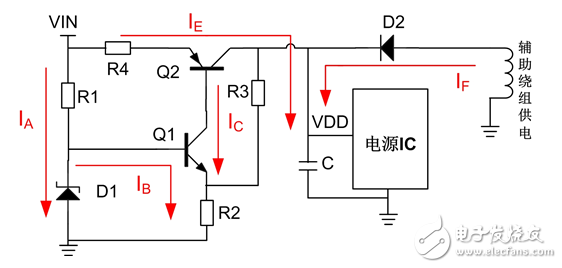 輸入電壓VIN為NPN三極管Q1提供IB電流使用它處于放大區(qū),IC為放大電流也為PNP三極管Q2的基極,通過對IC電流的控制,可使Q2處于飽和狀態(tài)并以IE的飽和電流向電容C充電,直到 Q2處于半截止或半飽和狀態(tài)。此時,電容就等效成一個恒流源為IC芯片提供能量,當(dāng)電容電壓降到一定值時,啟動電路繼續(xù)為電容充電,直到輔助供電有電壓后,才通過電阻R2、R3之間的分壓使Q1處于截止?fàn)顟B(tài),此時啟動電路才停止工作,之后芯片的供電完全由輔助繞組提供。
