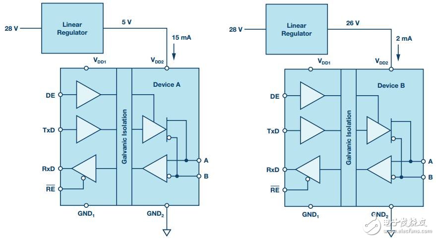 “更好”是一個(gè)定性術(shù)語,具體取決于所討論的參數(shù)。例如,當(dāng)涉及到速度、CMRR、PSRR時(shí),越高越好;當(dāng)涉及到失調(diào)電壓、漂移時(shí),越低越好;而您不需要太多工程知識(shí)就知道功耗總是越低越好。真的是這樣嗎?在這個(gè)特殊案例中,并非如此。舊收發(fā)器閑置狀態(tài)下在總線側(cè)消耗15mA(典型值)電流,而新器件僅消耗2mA(最大值)。毫無疑問,新器件在數(shù)據(jù)上看起來更好。不幸的是,線性穩(wěn)壓器似乎失常了。