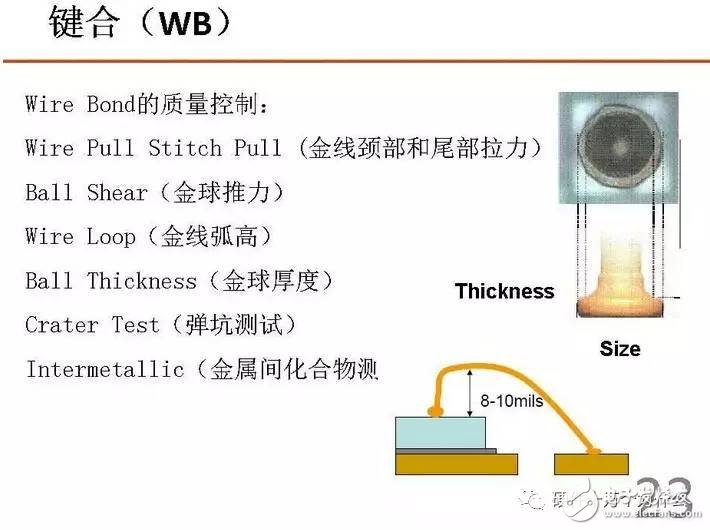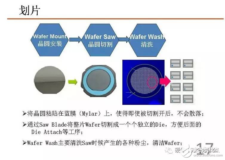 封裝的工序比較復(fù)雜,大概有十幾道工序,有磨片、劃片......磨片就是讓圓片背面減薄,適應(yīng)封裝需要;劃片就是通過金屬刀片,讓晶圓能夠一粒一粒地分割出來;裝片就是通過導(dǎo)電膠,讓芯片跟引線框固定起來;鍵合就是通過芯片的pad與框架之間實現(xiàn)電路導(dǎo)通;塑封就是把產(chǎn)品包裝起來。里面的關(guān)鍵工序是“鍵合和塑封”,鍵合實現(xiàn)了我們的目的,塑封對鍵合實現(xiàn)品質(zhì)保證和產(chǎn)品的可靠性。