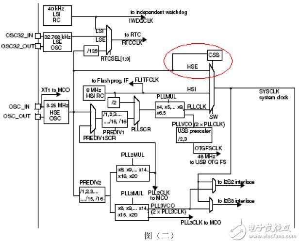 STM32 中的 CSS 功能是專門(mén)為檢測(cè)和處理 HSE 失效而設(shè)計(jì)的。但該功能在 STM32 復(fù)位后是被禁止的,須要軟件對(duì)其使能才會(huì)發(fā)揮作用。當(dāng) CSS 單元檢測(cè)到 HSE 失效時(shí),它會(huì)使能 HSI,并將系統(tǒng)時(shí)鐘切換到 HSI。同時(shí),它會(huì)關(guān)閉 HSE,如果 PLL 的輸入信號(hào)來(lái)自 HSE的輸出,它也會(huì)關(guān)閉 PLL。CSS 單元在做時(shí)鐘調(diào)整的同時(shí),也會(huì)產(chǎn)生一個(gè) NMI 中斷請(qǐng)求,和一個(gè)送給高級(jí)定時(shí)器的剎車信號(hào)。NMI 中斷請(qǐng)求會(huì)產(chǎn)生一個(gè) NMI 中斷,以便用戶程序可以在中斷服務(wù)程序中做緊急處理,而剎車信號(hào)則是使高級(jí)定時(shí)器進(jìn)入剎車狀態(tài),以防止由其控制的電機(jī)驅(qū)動(dòng)橋臂由于失去控制而過(guò)流。用戶程序可以在 NMI 中斷服務(wù)程序中嘗試恢復(fù) HSE 及 PLL 的功能,也可以使用陷阱讓程序的流程停留在服務(wù)程序中,從而等待看門(mén)狗復(fù)位整個(gè)系統(tǒng)。