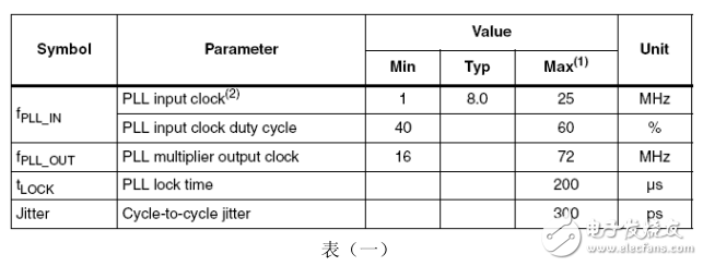 從 STM32F103VD 的數(shù)據(jù)手冊(cè)中查找 PLL 相關(guān)的參數(shù)如表(一):