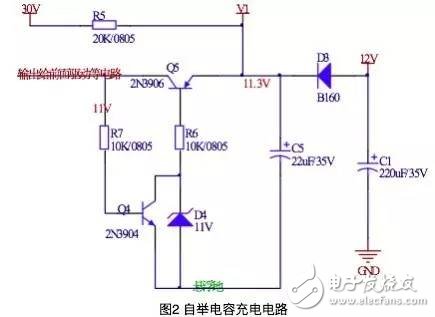 沿著這個(gè)思路,首先選擇開關(guān)管,由于是接在電源端,所以這里選擇P管,要想充到12V左右導(dǎo)通,可以選擇一個(gè)11V的穩(wěn)壓二極管串在b和地之間。為了限流,加一個(gè)限流電阻。但是由于存在著這個(gè)穩(wěn)壓二極管,當(dāng)自舉電容的電壓稍有降低,比如降到11V,則開關(guān)管就關(guān)斷了,而輸出電壓升到12V需要一段時(shí)間,沒有達(dá)到比自舉電容高的電位,就無法給自舉電容充電,電路就無法繼續(xù)工作。而造成這個(gè)的關(guān)鍵就是11V的穩(wěn)壓二極管,如果當(dāng)開關(guān)打開后,就把這個(gè)二極管短路,那么就可以解決這個(gè)問題,所以這里也需要一個(gè)開關(guān),而且是短接到地,選擇N管,具體如圖2所示。圖中Q5為PNP,Q4為NPN,開機(jī)一上電,Q5關(guān)閉,30V經(jīng)過R5給C5充電,充至12V左右,Q5導(dǎo)通,則其集電極電位達(dá)到11.3V,利用這點(diǎn)電位,去驅(qū)動Q4導(dǎo)通,這樣就可以實(shí)現(xiàn)Q4短路D4,這樣即使自舉電容降低到6V依然可以使Q5導(dǎo)通,繼續(xù)輸出電流維持驅(qū)動電路工作,從而帶動整個(gè)電路工作。