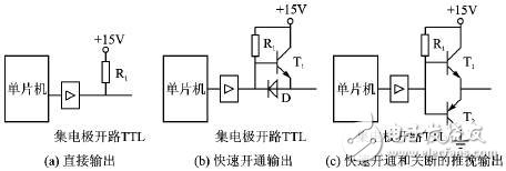 為了改善開關速度,可采用2種改進形式輸出電路,如圖7(b)和圖7(c)所示。圖7(b)是能快速開通的改進電路,當TTL輸出高電平 時,輸出點通過晶體管T1獲得電壓和電流,充電能力提高,從而加快開通速度,同時也降低了集電極開路TTL器件上的功耗。圖7(c)為推挽式的改進電路, 采用這種電路不但可提高開通時的速度,而且也可提高關斷時的速度。輸出晶體管T1是作為射極跟隨器工作的,不會出現飽和,因而不影響輸出開關頻率。