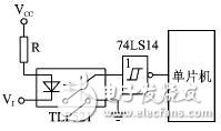 此外,一種常用的輸入方式是采用光耦隔離電路。如圖4所示,R為輸入限流電阻,使光耦中的發(fā)光二極管電流限制在10~20 mA。輸入端靠光信號耦合,在電氣上做到了完全隔離。同時,發(fā)光二極管的正向阻抗值較低,而外界干擾源的內阻一般較高,根據分壓原理,干擾源能饋送到輸入 端的干擾噪聲很小,不會產生地線干擾或其他串擾,增強了電路的抗干擾能力。