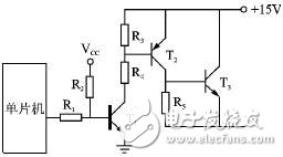 T1截止、T2導通期間,為了對T2提供足夠的基極電流,R2的阻值必須很小。因為T2處于射極跟隨器方式工作,因此為了減少T2損耗,必 須將集射間電壓降控制在較小范圍內。這樣集基間電壓也很小,電阻R2阻值很小才能提供足夠的基極電流。R2阻值過大,會大幅度增加T2壓降,引起T2發(fā)熱 嚴重。而在T2截止期間,T1必須導通,高壓+15 V全部降在電阻R2上,產生很大的電流,顯然是不合理的。另外,T1的導通將使單片機高電平輸出被拉低至接近地電位,引起輸出端不穩(wěn)定。T2基極被T1拉 到地電位,若其后接的是感性負載,由于繞組反電勢的作用,T2的發(fā)射極可能存在高電平,容易引起T2管基射結反向擊穿。
