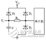 為了防止外界尖峰干擾和靜電影響損壞輸入引腳,可以在輸入端增加防脈沖的二極管,形成電阻雙向保護電路,如圖3所示。二極管D1、D2、 D3的正向導通壓降UF≈0.7 V,反向擊穿電壓UBR≈30 V,無論輸入端出現何種極性的破壞電壓,保護電路都能把該電壓的幅度限制在輸入端所能承受的范圍之內。即:VI~VCC出現正脈沖時,D1正向導 通;VI~VCC出現負脈沖時,D2反向擊穿;VI與地之間出現正脈沖時,D3反向擊穿;VI與地之間出現負脈沖時,D3正向導通,二極管起鉗位保護作 用。緩沖電阻RS約為1.5~2.5 kΩ,與輸入電容C構成積分電路,對外界感應電壓延遲一段時間。若干擾電壓的存在時間小于τ,則輸入端承受的有效電壓將遠低于其幅度;若時間較長,則D1 導通,電流在RS上形成一定的壓降,從而減小輸入電壓值。
