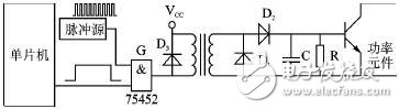 這種電路必須有一個脈沖源,脈沖源的頻率是載波頻率,應至少比單片機輸出頻率高10倍以上。脈沖源的輸出脈沖送入控制門G,單片機輸出信號 由另一端輸入G門。當單片機輸出高電平時,G門打開,輸出脈沖進入變壓器,變壓器的副線圈輸出與原邊相同頻率的脈沖,通過二極管D1、D2檢波后經濾波還 原成開關信號,送入功率管。當單片機輸出低電平時,G門關閉,脈沖源不能通過G門進入變壓器,變壓器無輸出。