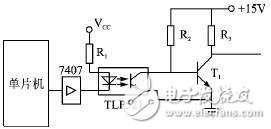 光電耦合可以傳輸線性信號,也可以傳輸開關信號,在輸出級應用時主要用來傳遞開關信號。如圖9所示,單片機輸出控制信號經緩沖器7407放 大后送入光耦。R2為光耦輸出晶體管的負載電阻,它的選取應保證: 在光耦導通時,其輸出晶體管可靠飽和;而在光耦截止時,T1可靠飽和。但由于光耦響應速度慢使開關延遲時間加長,限制了其使用頻率。