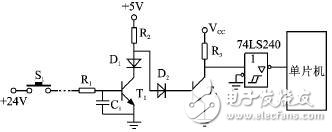 若考慮到由于TTL電平電壓較低,在長線傳輸中容易受到外界干擾,可以將輸入信號提高到+24 V,在單片機入口處將高電壓信號轉換成TTL信號。這種高電壓傳送方式不僅提高了耐噪聲能力,而且使開關的觸點接觸良好,運行可靠,如圖2所示。其 中,D1為保護二極管,反向電壓≥50 V。