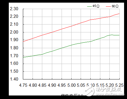差分電壓除負(fù)載電阻的影響外,還會(huì)受到供電電壓的影響,如圖2我們測試了CTM1051M模塊在不同電壓,不同負(fù)載下的差分電壓幅值,可以看到電源電壓升高0.5V,差分電壓幅值會(huì)升高約0.3V。