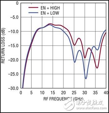 LTC5596 的 RF 輸入準確地阻抗匹配至 50Ω (從 100MHz 至高達 40GHz),如圖 1 中的實測回程損耗所示。