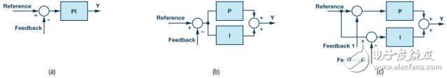 舉個例子,考慮圖1 (a)所示的常規(guī)比例積分控制器(PI)。 P部分和 I 部分采用相同的反饋信號工作,意味著該信號的動態(tài)特性必須適合兩種控制路徑。不過,P路徑和I路徑可以分離,如圖1 (b)所示。由此還可以再前進一小步,圖1 (c)顯示P路徑和I路徑分離,并且采用具有不同動態(tài)特性的反饋信號工作。