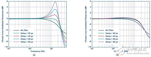 作為對比,圖3(a)顯示了反饋路徑(無雙反饋)中僅使用一個sinc濾波器時的閉環(huán)幅度響應。開關頻率fsw為10 kHz,奈奎斯特頻率設置為5 kHz。在這些系統(tǒng)參數下,對于0 μs至80 μs的sinc濾波器群延遲,繪制閉環(huán)響應曲線。注意,群延遲與抽取率直接相關。同預期一樣,低抽取率和群延遲對閉環(huán)穩(wěn)定性的影響很小,但隨著延遲增加,系統(tǒng)阻尼變得越來越小。