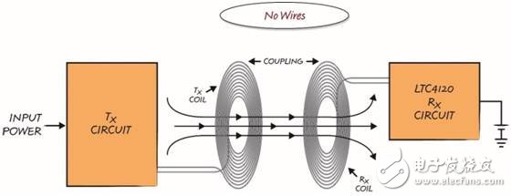 圖 1:從主端發(fā)送線圈 (Tx) 向副端接收線圈 (Rx) (包括 LTC4120) 的無線功率傳輸