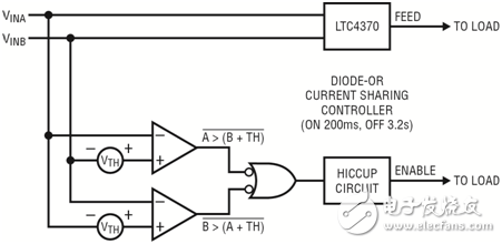 這里介紹的解決方案檢測(cè)輸入電壓差,并在檢測(cè)到設(shè)定的電源電壓之差時(shí),停用下游負(fù)載。這個(gè)電壓差設(shè)定為低于 LTC4370 的最大電壓門(mén)限。如果檢測(cè)到失衡情況,那么下游電源就被停用。為了防止發(fā)生震蕩情況,電路進(jìn)入打嗝模式,電源每隔 3.2 秒周期性接通 200ms。方框圖如圖 1 所示。