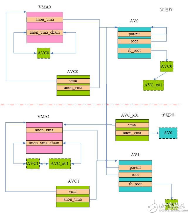 首先看看如何建立子進程VMA1和父進程AV0的關(guān)系,這里需要遍歷VMA0的anon_vma_chain鏈表,當然現(xiàn)在這個鏈表只有一個AVC0(link到AV0),為了建立和父進程的聯(lián)系,我們分配了AVC_x01,它是一個橋梁,連接了父子進程。(注:AVC_x01中的x表示連接,01表示連接level 0和level 1)。通過這個橋梁,父進程可以找到子進程的VMA(因為AVC_x01插入AV0的紅黑樹中),而子進程也可以找到父進程的AV(因為AVC_x01插入VMA1的鏈表中)。