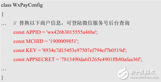 要使用微信支付,必須先開通公眾號或企業(yè)號微信支付的相關(guān)功能,這里不對如何開通做過多說明,在開通微信支付后,微信會提供商戶信息,如商戶號、支付秘鑰等。我們需要替換/lib/WxPay.Config.php文件的商戶信息(SDK中的文件,已經(jīng)被我們拷貝到nginx服務(wù)器根目錄),修改的位置如下: