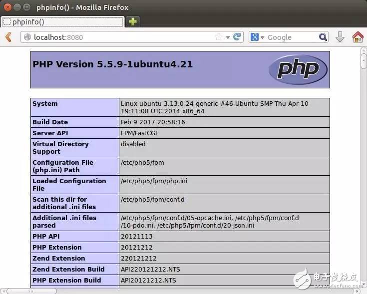 打開本地瀏覽器,輸入地址localhost:8080即可看到對應(yīng)PHP頁面,如圖 8所示,此時PHP+NGINX環(huán)境搭建已完成。