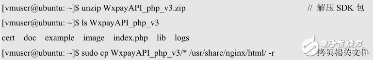 將下載好的微信支付PHP版本的SDK進(jìn)行解壓,并將相關(guān)文件拷貝到nginx服務(wù)器根目錄(默認(rèn)為/usr/share/nginx/html,可通過修改/etc/nginx/sitesavailable/default的root參數(shù)進(jìn)行指定,這里我們使用默認(rèn)參數(shù)):