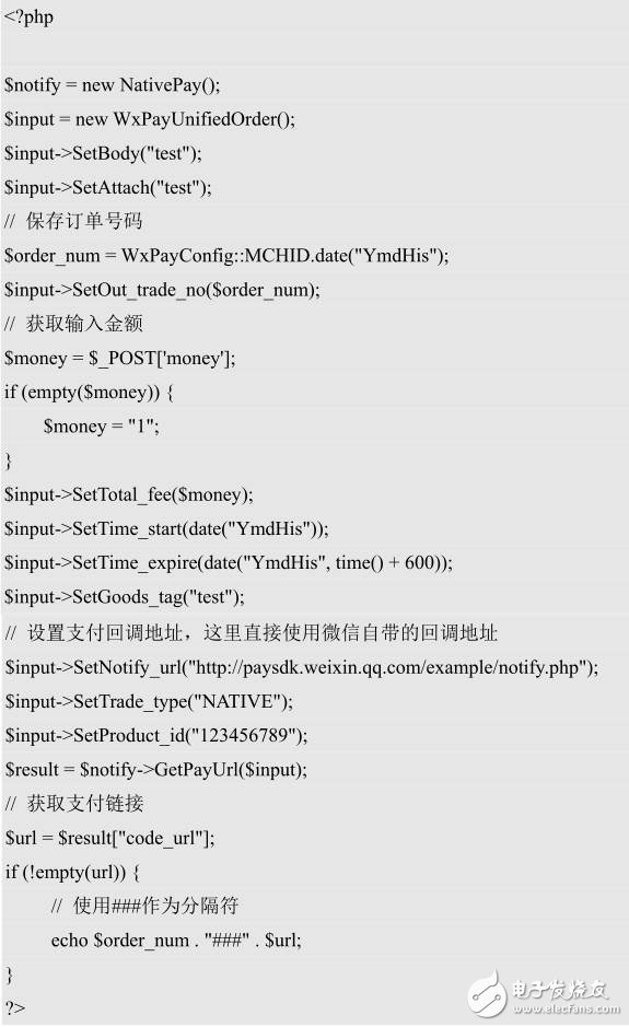 掃碼支付接口位于/example/native.php文件中,原生SDK包中有示例代碼,我們對其進(jìn)行修改,實(shí)現(xiàn)的執(zhí)行流程為獲取輸入金額→請求微信支付鏈接→下發(fā)鏈接地址及訂單號,這里我們使用了分隔符簡單進(jìn)行數(shù)據(jù)的封裝,實(shí)際應(yīng)用中可以加入JSON或XML格式的響應(yīng)報文。修改后的代碼如下: