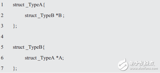 此時,struct _TypeA和struct _TypeB是互相引用的,雖然無論先聲明哪一邊都很麻煩,但可以先通過聲明結構體標記回避以上問題。比如: