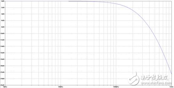 圖2顯示了濾波器響應(yīng)性能。此濾波器不需要具有高選擇性,其作用只是衰減放大器的寬帶噪聲和采樣過程中的非線性成分。在高頻時,電感開路,電容短路,將采樣過程的高頻成分導(dǎo)入50Ω端接電阻中。如果走線布置在50Ω電阻處,則不會有任何回路反射,ADC的SFDR不會下降。