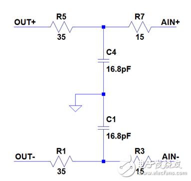 圖1顯示了一個可用在LTC6409和AD9265之間的吸收式濾波器網(wǎng)絡(luò)。
