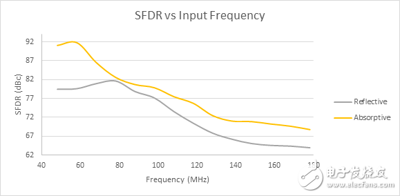 采用吸收網(wǎng)絡(luò)的SFDR自始至終都更好,在某些點超出10dB之多;