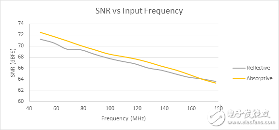 采用吸收網(wǎng)絡(luò)的系統(tǒng)性能優(yōu)于采用反射網(wǎng)絡(luò)的系統(tǒng)。當(dāng)使用反射網(wǎng)絡(luò)時,LTC6409和AD9265的出色性能會下降。對于LTC6409和AD9265,結(jié)果是很清楚的,但使用高吸收性且對稱的輸入網(wǎng)絡(luò)的做法也可應(yīng)用于任何直接采樣ADC和差分放大器。在放大器和ADC之間的接口上下功夫,便可實現(xiàn)最高性能。