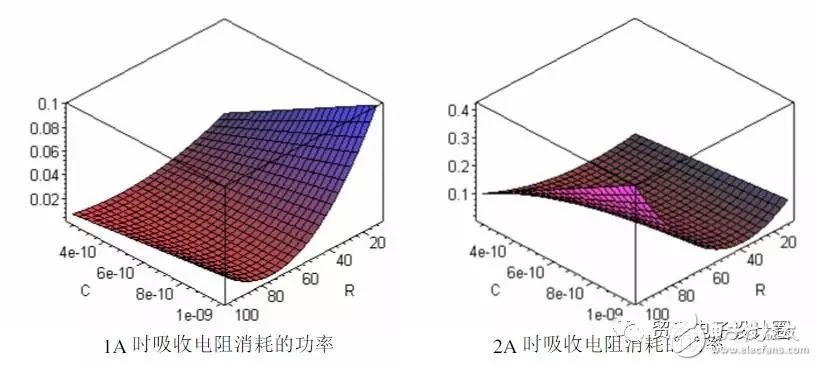 可以看到吸收功率始終隨吸收電容C值的增大而增大,但是不同的截止電流隨吸收電阻R值的變化會有不同的變化。