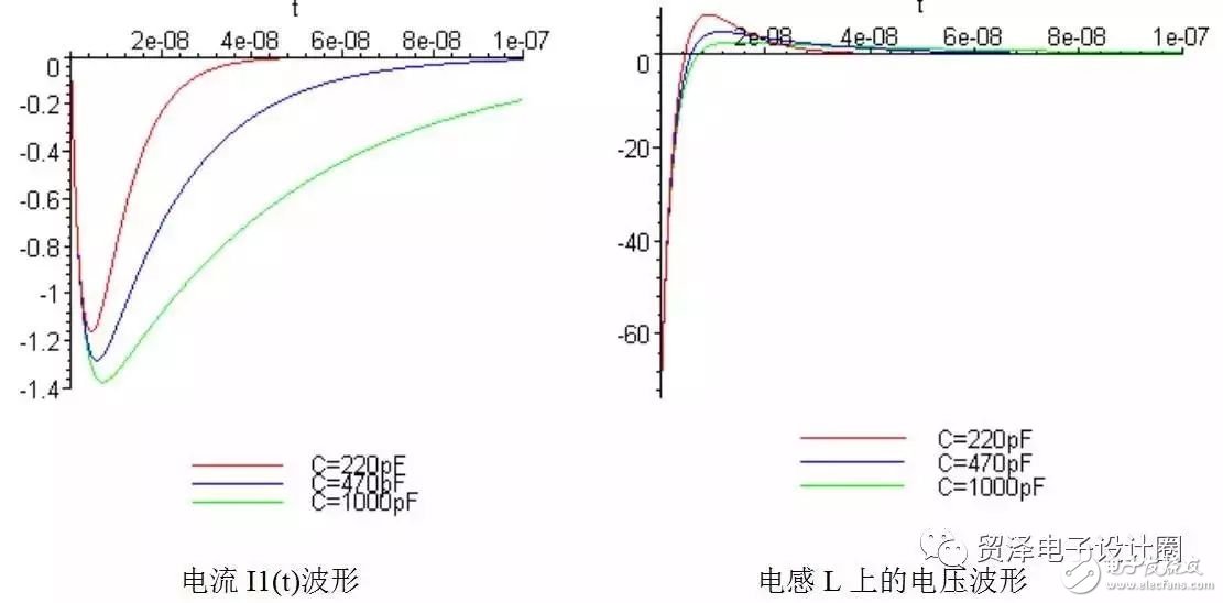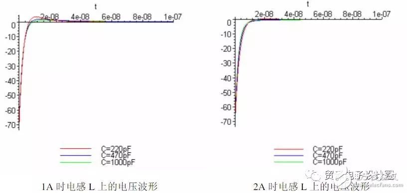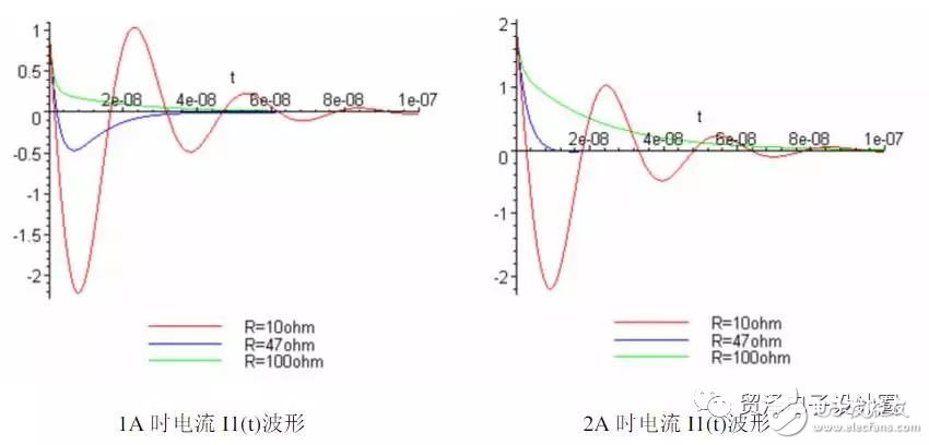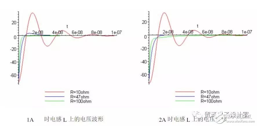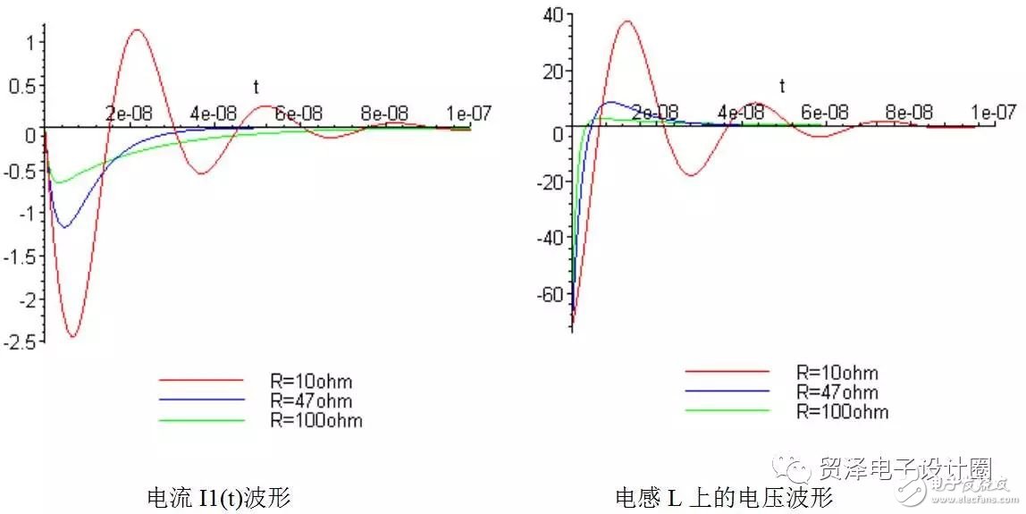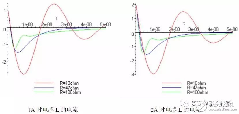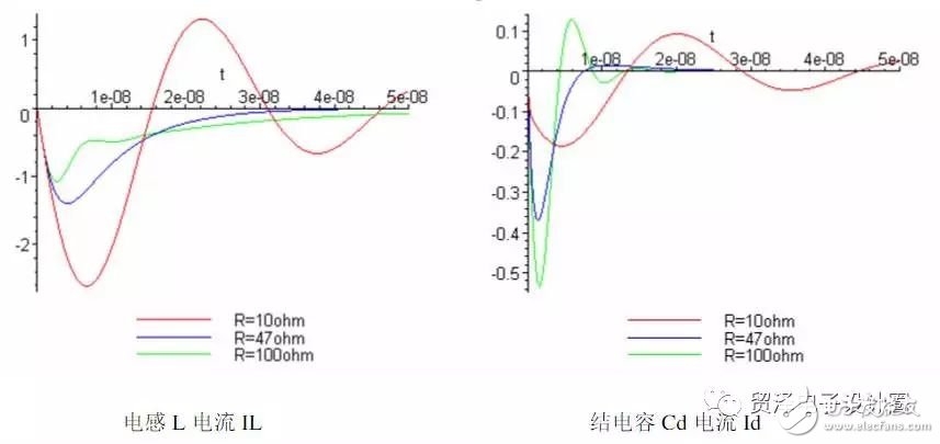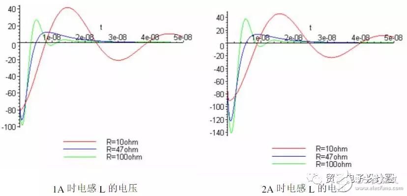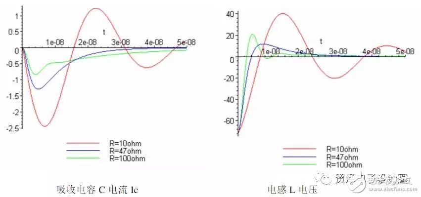 可以看到阻值越小,電壓電流的波形振蕩越多,峰值越高,越容易對回路產(chǎn)生不利影響,因此要保證工作在過阻尼狀態(tài),電阻R不能取小。