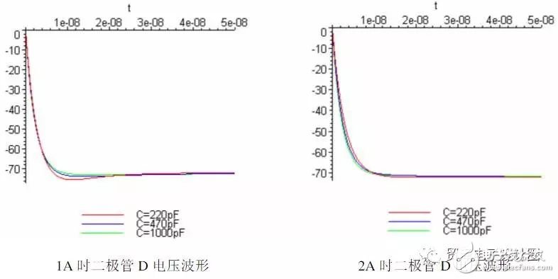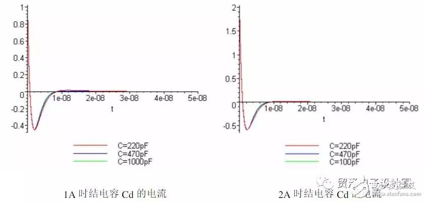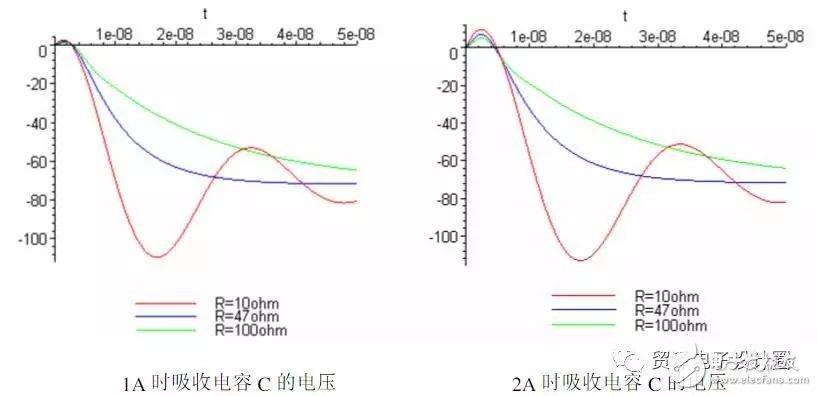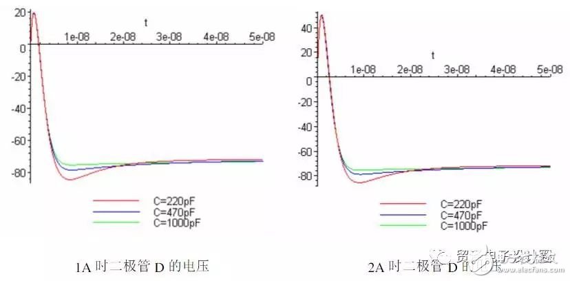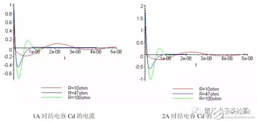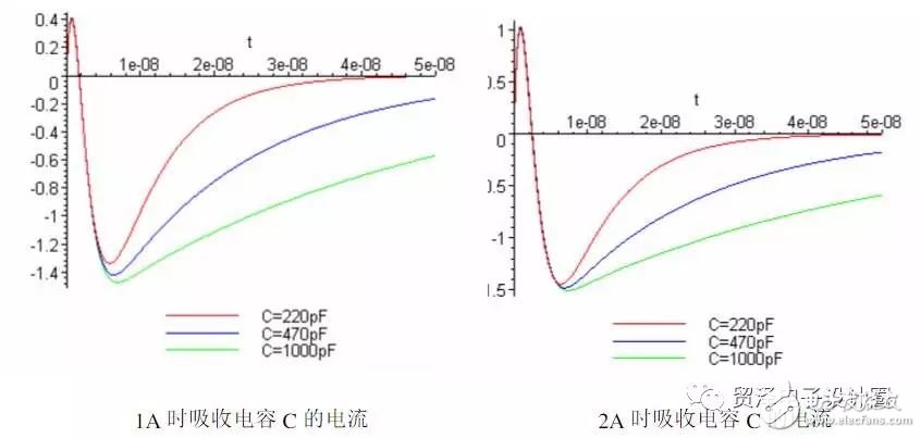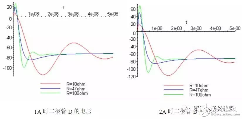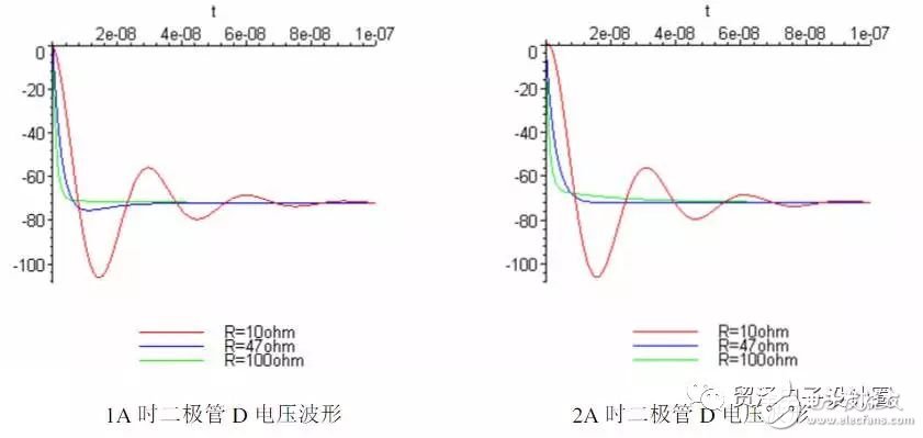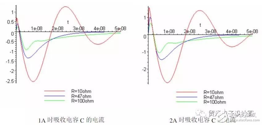 可以看到如果吸收電阻R偏大,流過結(jié)電容的電流也會增加,并且震蕩也比較厲害,對二極管D會有不利影響,起不到保護(hù)二極管的作用。