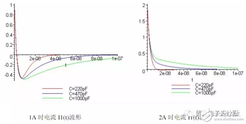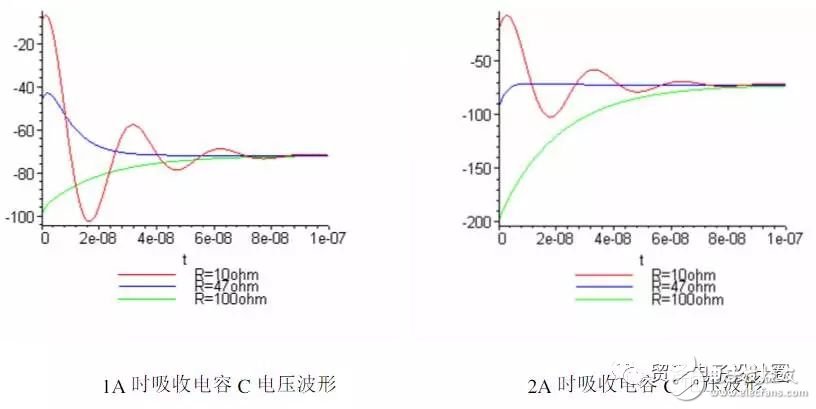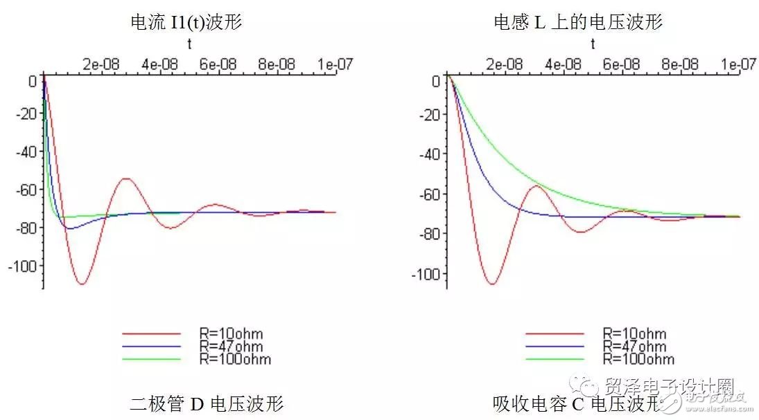 可以看到當(dāng)截止電流比較大時(shí),電阻越大電流下降越慢,吸收電容上初始電壓就會越高,對電容耐壓要求就會越高,此時(shí)電感L及二極管D兩端電壓變化也會更快,對回路產(chǎn)生不利影響的可能性會更大,因此吸收電阻R取值也不能太大。