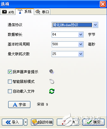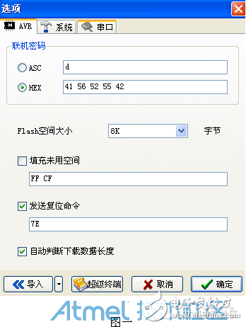2) 設(shè)置 AVRUBD 。 點(diǎn)擊“選項”,點(diǎn)擊下拉菜單的AVR, 先將“ AVR ” 選項卡下的參數(shù)設(shè)置為圖 一 的要求, 注意 flash 空間大小是8K (這個根據(jù)具體mcu設(shè)置,如xmage16,應(yīng)設(shè)置為16K); 聯(lián)機(jī)密碼為HEX:41 56 52 55 42;然后選“系統(tǒng)” 卡片, 設(shè)成圖二 所示, 注意通訊協(xié)議要選簡化 Xmodem 協(xié)議;數(shù)據(jù)幀長度為:64,(根據(jù)mcu串口接收buff設(shè)置,如xmage16應(yīng)設(shè)置為256); 再選“串口 ” 卡片, 將其設(shè)成圖三 所示, 其中串口號要根據(jù)你所用電腦實際串口確定;波特率為38400; 完成以上設(shè)置后點(diǎn)擊“確定”