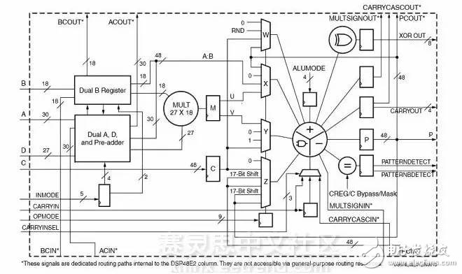 在論文中,作者詳細闡述了Xilinx的產品,主要是從Virtex-4 FPGA開始到Xilinx后來的所有全可編程芯片等多代產品內部的DSP48 slices的一個發(fā)展過程:首先,Virtex-4 FPGA系列包含一18X18bit乘法器和48bit累加器的XtremeDSP(DSP48);之后的Virtex-6系列FPGA加入了25x18bit乘法器和48bit累加器的DSP48 slices ;較新的7系列FPGA和Zynq-7000系列SoC則內嵌了25x18bit乘法器和48bit累加器的DSP48 slices;而最強的UltraScale/UltraScale+系列FPGA則包括了27x18bit乘法器和48bit加法器的DSP48E2。除此之外,在Xilinx每一代FPGA的DSP48 slices的發(fā)展中都有很多額外的改進,比如時鐘率具有較穩(wěn)定的提高,也正是這么多代產品的不斷迭代,才使得現(xiàn)在的DSP48E2 功能更加強大。下圖是論文中作者提到的關于DSP48E2 功能實現(xiàn)的細節(jié)。