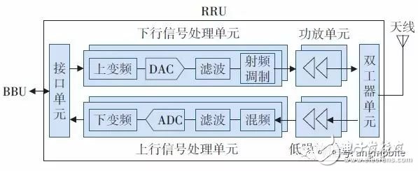 對于多通道RRU,比如2T2R RRU,內(nèi)部存在2條相同的信號處理鏈路,完成對2路信號的上下行信號處理及收發(fā)。對于多模RRU,要求接口單元、上下行信號處理單元可支持對多制式信號的處理,功放、雙工器、低噪放等模擬器件要求支持更大的瞬時工作帶寬。